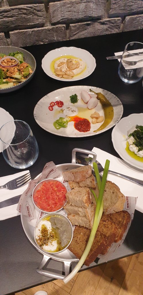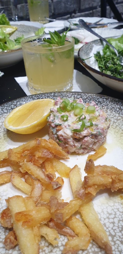 התפריט נפתח בלחמים באפייה מקומית בליווי ממרחים וסלטים מקומיים ולאחריו ראשונות כמו: טרטר ואגיו (79 שקלים); פיקניה על גחלים ( 79 שקלים); מרגז וכרוב צלוי בפחם ( 68 שקלים); סיגר גבינות בשילוב קרפצ'ו בקר (64 שקלים).