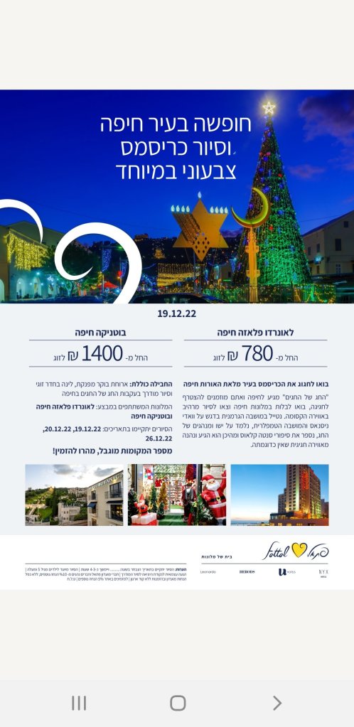 מלון בוטניקה חיפה – 11.12, 28.12, 8.1 – לילה לזוג פלוס ארוחת בוקר פלוס סיור החל מ 1400 ש"ח.המלון החדש בחיפה שנפתח לאחרונה ,בעיצוב מרהיב ויוקרתי ובמיקום מושלם מול הנוף של הגנים הבהאים , הינו לוקיישן מדוייק לתקופת הכריסמס. כל בתי הקפה והמסעדות בשד' בן גוריון מקושטות ונוצצות בקישוטי חג המולד והינן במרחק כמה צעדים מהמלון. וואדי ניסנאס הססגוני והטעים במרחק הליכה קצרה.