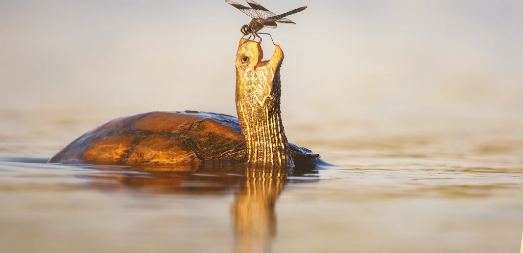 עוד מוצג בתערוכה צילום של צחי פינקלשטיין המתאר רגע מיוחד בין שני יצורים שונים מאד: צב ביצות ושפירית מהמין נחתנית דרכים, שנחה על אפו. שפיריות ממין זה נוהגות לנחות על דרכים ומכאן שמן. במקרה זה ראתה השפירית את אפו של הצב, המתרומם ונישא מן המים, כמקום נחיתה מתאים, ונראה שהצב ״המחייך״ הופתע מהאורחת הלא צפויה.