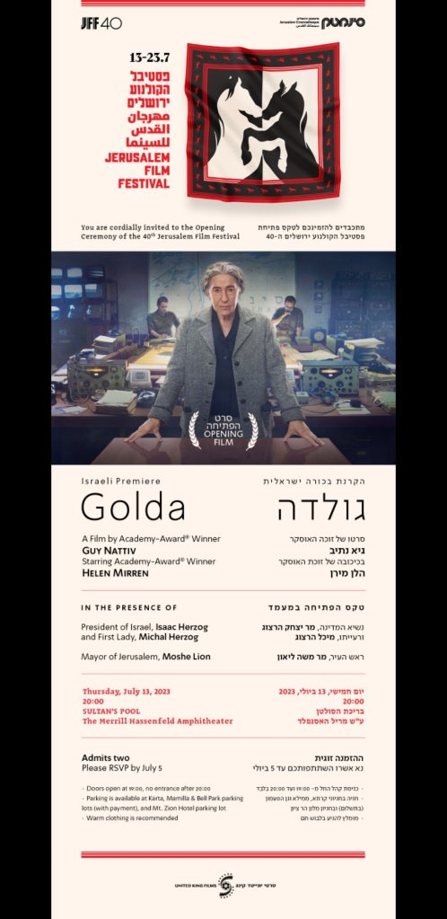 סרטו המדובר של זוכה האוסקר גיא נתיב בכיכובה של השחקנית הבריטית המוערכת הלן מירן, יוקרן בבכורה ישראלית במסגרת אירוע הפתיחה החגיגי בבריכת הסולטן ב־13 ביולי, אל מול קהל של 6,000 צופים, וייצא בבתי הקולנוע בארץ ובעולם ב-24.8.2023.