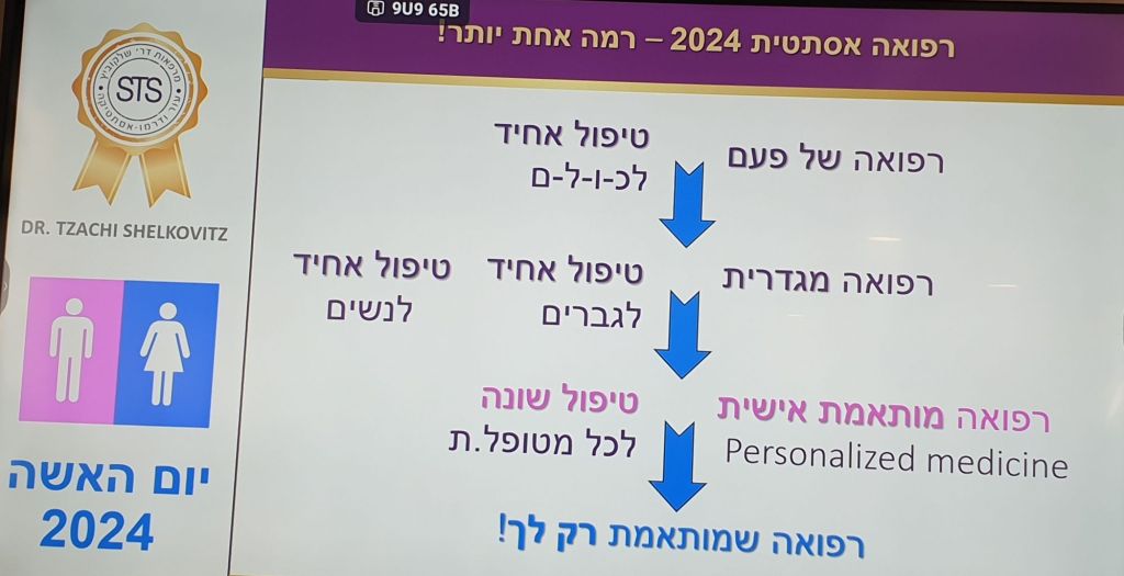 זכינו להאזין להרצאה מרתקת ומחכימה מפיו של ד"ר צחי שלקוביץ שהתחיל בהסברים על הטיפולים האסתטים שבעבר היו מיועדים לכולם ולאחר מכן פולחו לטיפולים לנשים וטיפולים לגברים, רפואה מגדרית. כמו טיפולי נשירה והתקרחות יש יותר פיתרונות לגברים מאשר לנשים או להבדיל כתמי פיגמנטציה שאין הבדלים מהותיים בין טיפולי גברים ונשים.