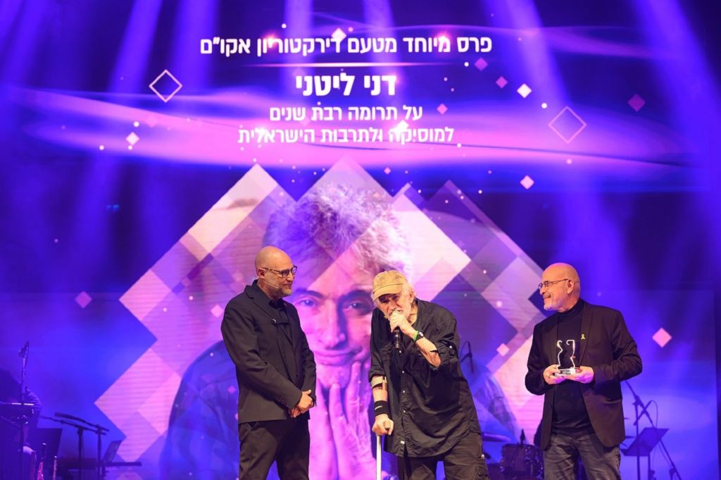 דני ליטני שריגש את הקהל שבגיל 81 עם מקל הליכה ומכשיר שמיעה קיבל את פרס מיוחד מדירקטוריון אקו"ם, אמר על הבמה: "אני רוצה לברך את ההורים השכולים ושיחזירו כבר את החטופים, זה בלתי ניתן לתפיסה".