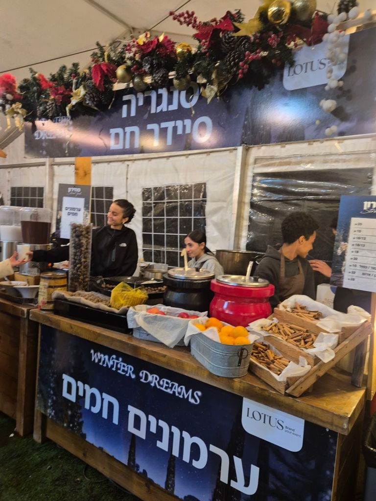 בנוסף, דוכנים של מרקים חמים: עדשים, עגבניות ובצל (35 ₪), סוגי יינות אדומים ולבנים (32 ₪), בירות ישראליות ממיטב מיבשלות הבוטיק בארץ ביניהן גם הרצל ומלכה (28 ₪), וכמו בשווקי כריסמס באירופה עמדות פיש אנד צ'יפס (45 ₪) צ'ורוס מתוקים (25 ₪), ערמונים ושקדים קלויים, פופקורן, שוקו חם ותירס חם לילדים (15-18 ₪) סנגריה חמה, סחלב חם (20 ₪) וסיידר חם (15 ₪) ,דוכן תפוח אדמה מדורה וגם דוכן סופגניות בתקופת החנוכה.