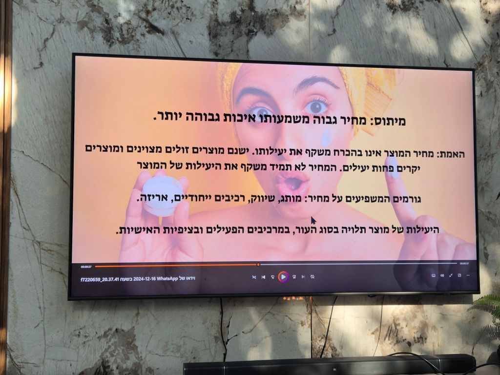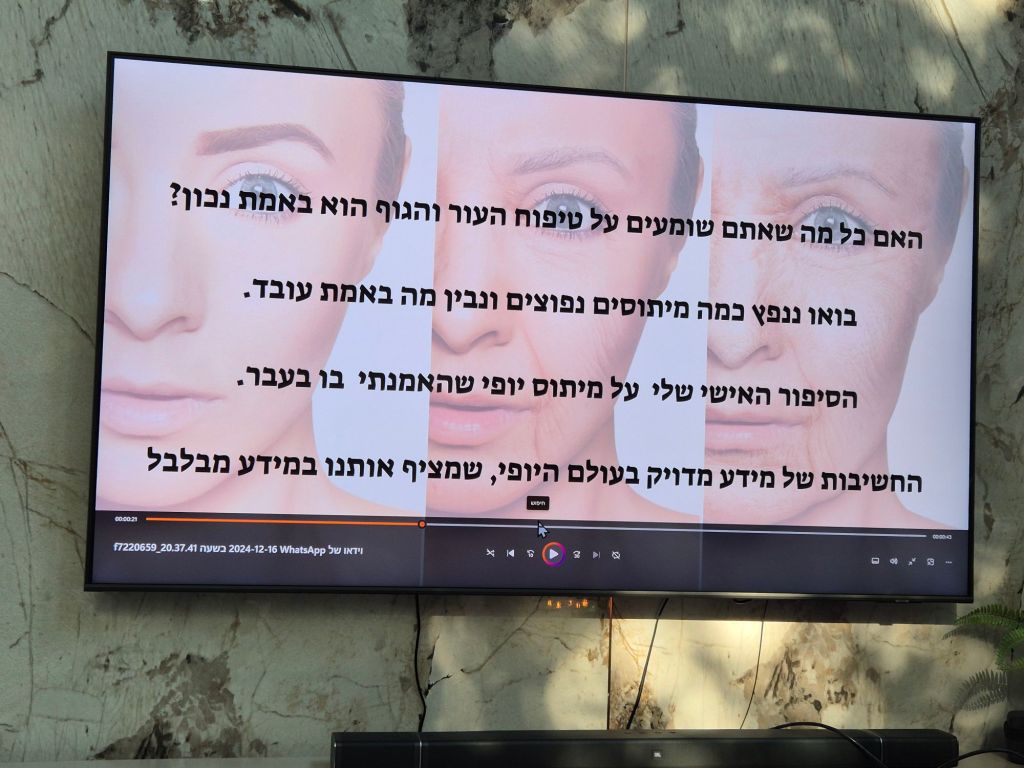 שמענו הרצאה מרתקת מפיה של הלגה רקנטי שהרצתה בפנינו תוך כדי ניפוץ כמה וכמה מיתוסים הנפוצים בעולם היופי, מה שעזר לנו לגלות כיצד נוכל להבין ולהבדיל בין מציאות לסיפורי מעשיות ואגדות שאנו כלקוחות עולם היופי שומעים כל יום.