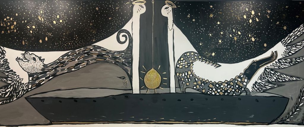 האמנית חן שיש ציירה בתערוכה ציור קיר בזהב ונצנצים, כדי להאיר מעט את המציאות סביב