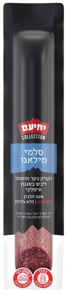 סלמי בקר מותסס בסגנון איטלקי המתאפיין בטעם מעודן, פחות חמצמץ, מתובל בתערובת תבלינים אופיינית ועשיר בחלבון – כ 26% ל-100 גרם • סלמי מילאנו מצטרף לסדרת COLLECTION המובחרת של יחיעם והוא ישווק פרוס באריזת נוחות של 125 גרם, כנקניק שלם במשקל במעדנייה וגם בסטנד הנקניקים היבשים ביחידות של 250 גרם