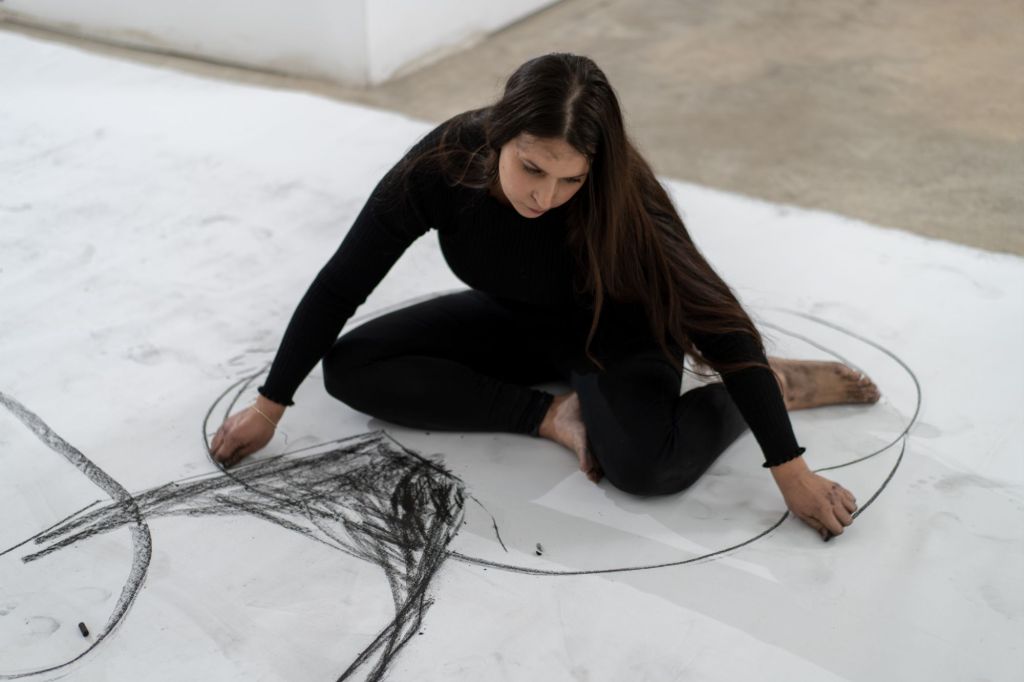 ציורי הפחם אדירי הממדים נוצרים על בדים שמונחים על הרצפה, האמנית פועלת עליהם ונעה בתוכם, תוך שהיא מטביעה את עקבות גופה ומתמזגת בהם. דמותה הופכת לחלק אינטגרלי מהיצירה.