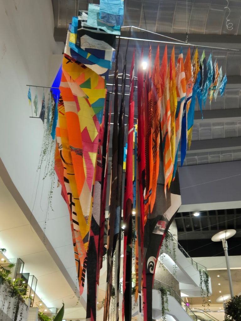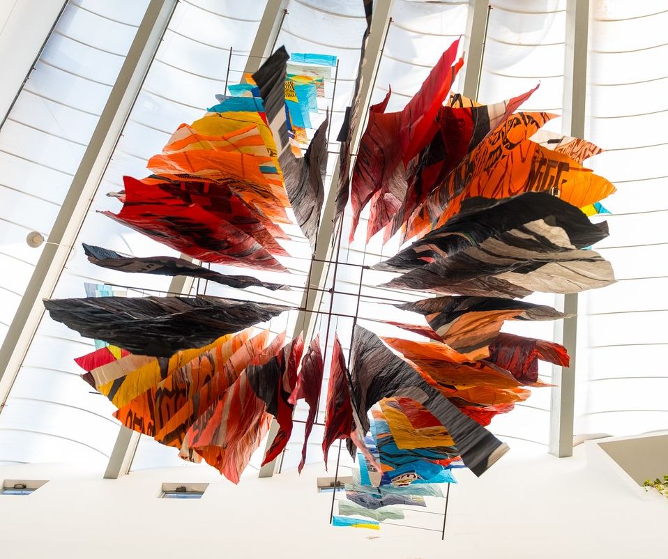 בבניין B מציבה האומנית ומעצבת הטקסטיל תמר ניקס מיצב תלוי תלת־ממדי עצום, העשוי ממצנחי ים משומשים
