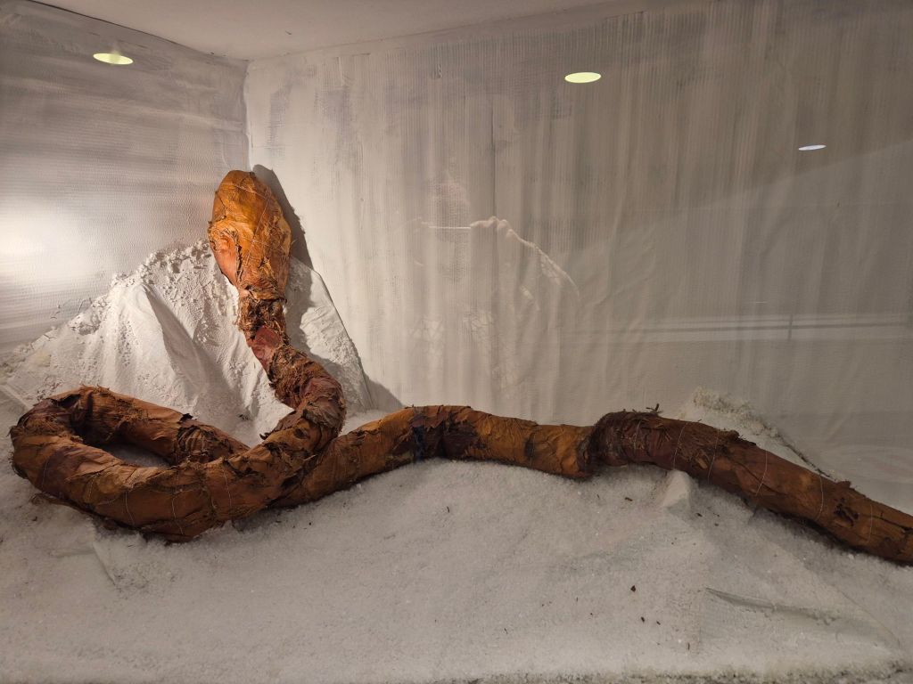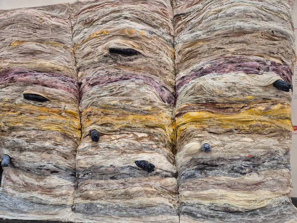 לצידה מציגה האומנית ירדן לוינזון את העבודה "הארכיאולוגיה של העתיד", העשויה מאשפת טקסטיל מעובדת ומדמה שכבות גיאולוגיות.