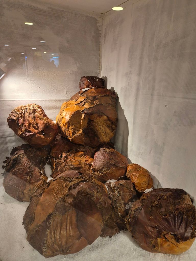 בעבודה של שירה שטיין, "חמישים מעלות בצל", פסולת חקלאית מכפות תמרים הופכת לבד דמוי עור המצל על משטחי מלח,