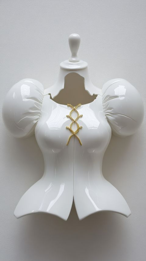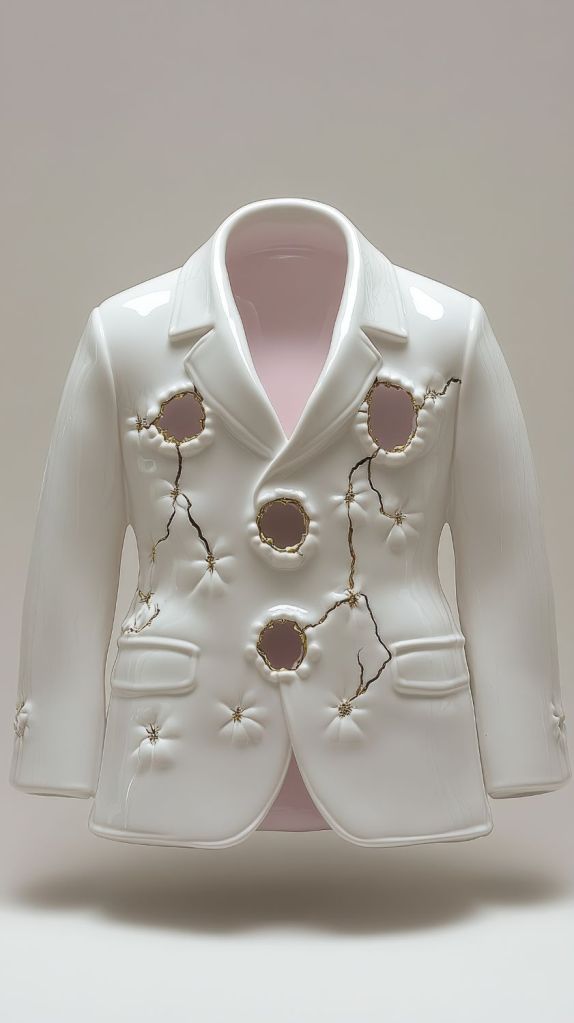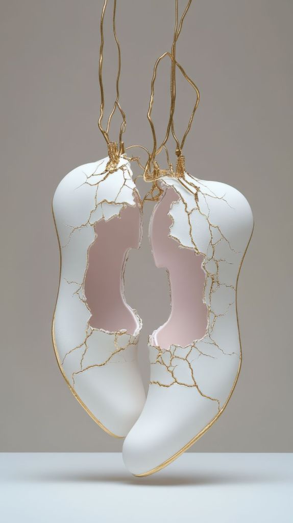 ז'קטים מחוררים בכדורים עשויים פורצלן, מחוכים עדינים שנשברו, נעלי ריקוד תלויות באוויר. עדות שקטה לאובדן, למאבק, ולרצון להמשיך לנוע.