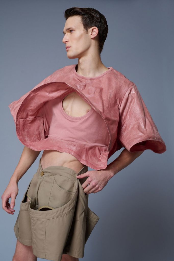 מה תפקידה של מעצבת אופנה בעידן שבו הכול כבר נעשה? זו השאלה שהניעה את עדי גז (נ׳ 1999): במקום לרדוף אחרי חידוש לשם חידוש, היא מערערת על מיתוס הדף הלבן ובוחרת ליצור בתוך מה שכבר קיים – לפרק ולעוות אותו, לחשוב דרכו. מתוך מחשבה על קיימות, נקודת המוצא של גז בתהליך העיצוב הייתה לקחת את פריטי הלבוש המוכרים, כמו מכנסיים וחולצה, ולערער על הצורה והמשמעות שלהם. היא עבדה עם טכניקות של מיחדוש – פירוק, הרכבה מחדש – וחיברה בין עולמות חומריים שלא ״אמורים״ להיפגש.