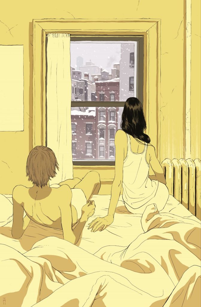 זוג צעיר יושב על מיטה זוגית, מביט בסופת השלג המתחוללת בחוץ. גבר חרדי עם זקן וחליפה שחורה עומד בגבו להיפסטר צעיר מזוקן ומקועקע, עם גופיה וג׳ינס קרוע. כמו בתמונת מראה, תומר חנוכה (נ׳ 1974) מציג את האינטימיות בין שני הזוגות שנאלצים להמתין: האינטימיות הרומנטית של הדירה הניו יורקית המחוממת יתר על המידה, אל מול האינטימיות הכפויה שכרוכה בנסיעה ברכבת התחתית. שני האיורים הופיעו על שער מגזין הניו יורקר, והם מבטאים את המנעד שבו פועל חנוכה – בין אמנות לאיור מערכתי – שבתוכו הוא יוצר דימויים מרגשים ומפתיעים.
