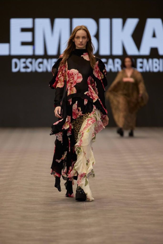 תצוגת אופנה אלמביקה בשבוע האופנה ישראל קנדה תל אביב 2025 צילום עומרי רוזנגרטבדי פסים מהארון הגברי מהווים השראה לשמלות ולחולצות רומנטיות, אליהן מצטרפים בדי משי בהדפסי פרחים אדומים על רקע שחור וקרם, לצד פרוות סינטטיות מנומרות ומלאות הומור. התוצאה היא שפע של שמלות רכות ונשפכות בגזרות מגוונות, בחיבורים עשירים ומפתיעים, היוצרים משחק מרתק בין נוסטלגיה, צבע ותחכום עיצובי.