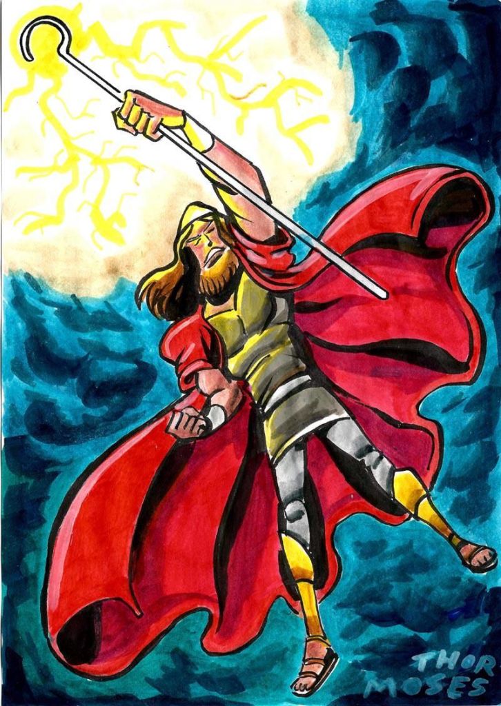 חדר גיבורי התנ"ך – דמויות תנ״כיות כמו שמשון הגיבור, דוד המלך ומשה רבנו היו השראה לדמוית המופיעות בתערוכה ״גיבורים כחול לבן״.